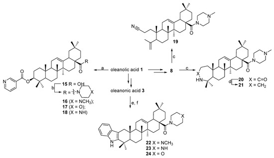 The esterification of oleanolic acid (1) by nicotinic acid chloride in a pyridine-tributylamine media under reflux led to 3β-nicotinoyloxy-derivative 15, which was further transformed into appropriate amide analogs 16–18.