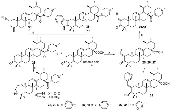 Synthesis of ursolic acid derivatives 25–36: (a) 3- or 4-pyridinecarboxaldehyde or furfural, 40% KOH, EtOH, rt, 8 h; (b) i (COCl)2, CH2Cl2, rt, 3 h; ii N-methylpiperazine, CH2Cl2, Et3N, ∆, 5 h; (c) NaBH4, i-PrOH, rt, 3 h; (d) i NH2OH∙HCl, NaOAc, EtOH, ∆, 4 h, 80–82%; ii SOCl2, dioxane, 1 h, rt; (e) LiAlH4, THF, 66 °C, 1 h; (f) PhNHNH2, AcOH, ∆, 5 h.