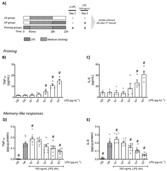 Cytokine responses of mouse bone marrow neutrophils primed by increasing doses of LPS. (A) Two-step stimulating schema used to induce memory-like inflammatory responses. Bone marrow neutrophils (1,000,000 cells/well) isolated from adult mice were stimulated with different doses of LPS (10 pg/mL to 100 ng/mL) on day 1 immediately after isolation for 45 min. Then, cells were washed and left in medium to rest for 18 h. On the next day (day 2), cells were re-stimulated with a fixed dose of LPS (100 ng/mL) for 4 h, followed by sample collection after the incubation time and processed for further analysis. Cytokine production of (B) TNF-α (n = 4) and (C) IL-6 (n = 4) by mouse bone marrow neutrophils stimulated (primed) with increasing doses of LPS analyzed by ELISA. (D,E) Opposing inflammatory responses of mouse bone marrow neutrophils primed by increasing doses of LPS, after a second challenge by a fixed dose LPS (100 ng/mL). Cytokine levels ((D): TNF-α, n = 9; E: IL-6, n = 9) assessed by ELISA (normalized to total protein concentration). Data are shown as scatter dot plots, mean + SEM, # p < 0.05, # significant differences vs. unstimulated condition (US) (B,C); # p < 0.05, # significant differences vs. unprimed condition (UP, gray column) (D,E).