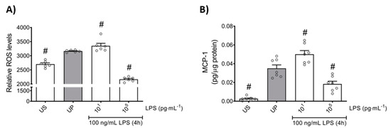 Effects of low- and high-dose LPS priming on ROS production and MCP-1 release in bone marrow neutrophils. Cells were primed with different doses of LPS (low-dose: 10 pg/mL; high-dose: 100 ng/mL) and re-challenged on day 2 with a fixed dose LPS (100 ng/mL) as described previously. (A) ROS levels (n = 6) were assessed by the 2′,7′–dichlorofluorescin diacetate (DCFDA) assay, whereas the production of (B) MCP-1 (n = 7) was measured using ELISA (normalized to total protein concentration). Data are shown as scatter dot plots, mean + SEM, # p < 0.05, # significant differences vs. unprimed condition (UP, gray column).