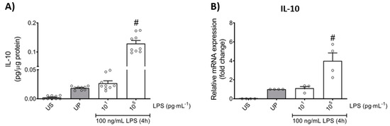 Effects of low- and high-dose LPS priming on the production of IL-10 as anti-inflammatory cytokine in mouse bone marrow neutrophils. Cells were primed with different doses of LPS (low-dose: 10 pg/mL; high-dose: 100 ng/mL) and re-challenged on day 2 with a fixed dose LPS (100 ng/mL) as described. Supernatants and RNA samples were collected 4 h after the second challenge. Production of (A) IL-10 (n = 9) was measured using ELISA (normalized to total protein concentration), whereas (B) gene expression of IL-10 (n = 4) by real-time PCR normalized to glyceraldehyde-3-phosphate dehydrogenase (GAPDH) representing relative values to unprimed state (assigned as 1.0). Data are shown as scatter dot plots, mean + SEM, # p < 0.05, # significant differences vs. unprimed condition (UP, gray column).