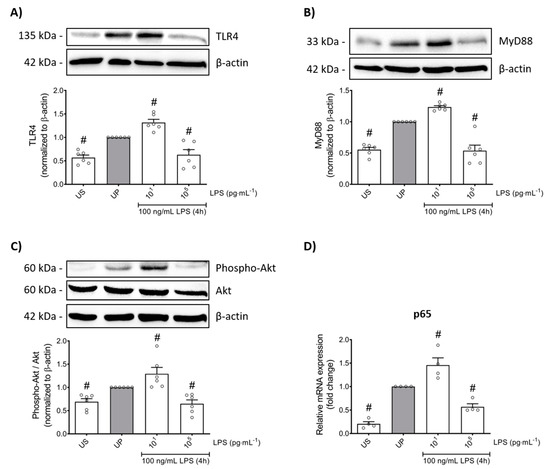 Primary antibodies, such as phospho-Akt (Ser473) (#9271), Akt (#9272), MyD88 (#4283), and TLR4 (#14358), were purchased from Cell Signaling (USA). The antibody against β-actin (#A5441) was obtained from Sigma Aldrich (St. Louis, MO, USA). Secondary HRP-coupled anti-rabbit and anti-mouse antibodies were purchased from Dianova (Hamburg, Germany).