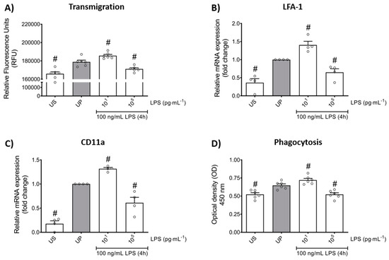 Effects of low- and high-dose LPS priming on the migratory effects and phagocytic activity of mouse bone marrow neutrophils in vitro. Cells were primed with different doses of LPS (low-dose: 10 pg/mL; high-dose: 100 ng/mL) and re-challenged on day 2 with a fixed dose LPS (100 ng/mL), as described. (A) Transmigration of neutrophils (n = 6) was analyzed by the CytoSelect 96-well Cell Migration Assay, as described (check Materials and methods, Section 4.8) and data were expressed as relative fluorescence units. RNA samples were collected 4 h after the second stimulation by LPS (100 ng/mL) and analyzed for (B) LFA-1 (n = 4) and (C) CD11a (n = 4) by real-time PCR normalized to GAPDH representing relative values to unprimed state (assigned as 1.0). (D) Phagocytic activity of mouse bone marrow neutrophils (n = 6) was assessed using a CytoSelect 96-Well Phagocytosis Assay kit (E. coli Substrate) and data were expressed as optical density (further check Material and methods, Section 4.9). Data are shown as scatter dot plots, mean + SEM, # p < 0.05, # significant differences vs. unprimed condition (UP, gray column).