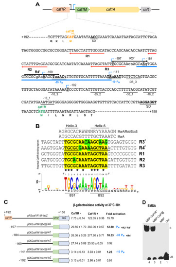 2.9. In Vivo Validation of the Identified Caf Promoters and Caf1R-Binding