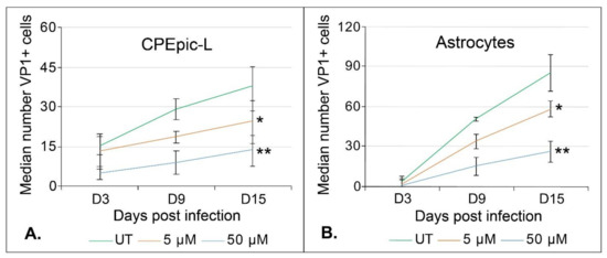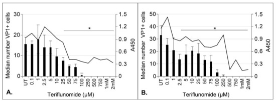The ability of teriflunomide to reduce JCPyV infection correlates with teriflunomide’s cytostatic effect in CPEpic-L and primary astrocytes. CPEpic-L (A) and primary astrocytes (B) were pretreated with teriflunomide for 1 h, infected, and maintained in the presence of teriflunomide for 5 days. Cells were fixed in 100% methanol and analyzed by indirect immunofluorescence analysis of VP1. The median number of VP1-positive cells (left axis) is plotted against the A450 (right axis) to show the relationship between decreased infection and the cytostatic effect of teriflunomide. Error bars indicate the IQR of each sample. There is a significant reduction in infection in CPEpic-L cells at 25 µM and above and in astrocytes at 2.5 µM and above. * = p < 0.05, Student’s t-test; UT = untreated; VP1 = viral protein 1; IQR = interquartile range.