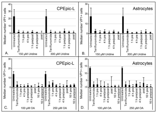Uridine or orotic acid failed to rescue JCPyV infection in teriflunomide-treated cells. CPEpic-L (A,C) and primary astrocytes (B,D) were infected and untreated or treated with teriflunomide, and treated with uridine (A,B) or orotic acid (C,D). Cells were treated with uridine for 1 h or 4 h prior to teriflunomide and maintained in teriflunomide only; or treated with uridine for 1 h or 4 h and maintained in both teriflunomide and uridine; or maintained in both uridine and teriflunomide without uridine pretreatment. Cells were treated with orotic acid for 1 h, 4 h, or 16 h prior to teriflunomide and maintained in teriflunomide only; or treated with orotic acid for 1 h, 4 h, or 16 h and maintained in both teriflunomide and orotic acid; or maintained in both orotic acid and teriflunomide without orotic acid pretreatment. All conditions were carried out in triplicate at high and low concentrations of uridine (300 µM and 150 µM, respectively) or orotic acid (250 µM and 100 µM, respectively) and using the previously established highest tolerable doses of teriflunomide as appropriate per cell type. Neither uridine nor orotic acid was able to rescue JCPyV infection under any of the tested conditions; there are no significant differences between the teriflunomide only treated samples and the orotic acid or uridine treated samples (p > 0.05 for all conditions containing uridine and orotic acid; Student’s t-test). Error bars indicate the interquartile range of each treatment. OA = orotic acid; VP1 = viral protein 1.