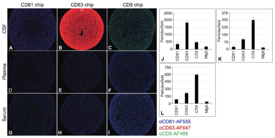 Exoview analysis of tetraspanin presentation on EV derived from CSF, plasma, and serum. Unlabeled EV were captured on CD9, CD63, or CD81 antibody chips. Bound EV were stained with αCD9-AF488 (green), αCD81-AF555 (blue), and αCD63-AF647 (red) (A–I). The intensity of each fluorescent antibody signal reflects the relative abundance of each tetraspanin. CD63 is the predominant EV marker in CSF (B,J). CD9 is the predominant EV marker in plasma (F,K) and serum (I,L). Average particle counts per 150-µM field of view for each captured tetraspanin before staining are shown for CSF (J), plasma (K), and serum (L). As expected, there are differences in tetraspanin expression between sample types. Error bars represent standard deviation. CSF = cerebrospinal fluid; EV = extracellular vesicles; MIgG = mouse immunoglobulin G.