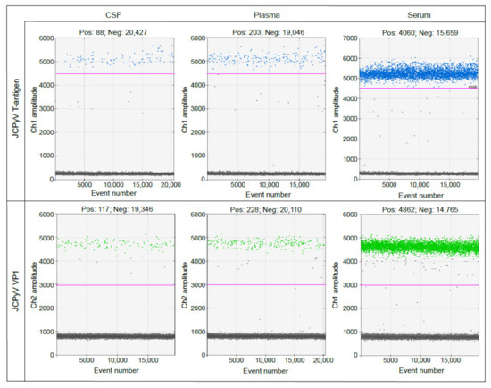 Examples of droplet count and thresholding used in the analysis. Controls were generated for each biofluid (plasma, serum, and CSF) by spiking 250 µL healthy donor fluid with 5 μL JCPyV-positive EV. EV were isolated using size-exclusion chromatography mini-columns (Izon, Christchurch, NZ) followed by ultrafiltration using Amicon Ultra-4 columns (Merck-Millipore, Burlington, MA, USA). Purified and concentrated EV were processed according to the workflow diagram and analyzed by ddPCR for JCPyV T-antigen and VP1 expression. The amplitude of each positive control was used to determine the threshold setting, shown as a pink line, for each probe set.