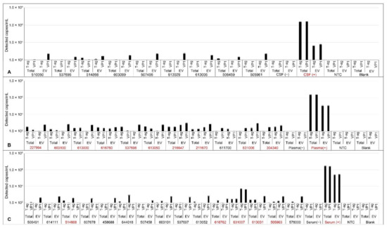 Individual ddPCR results for detection of JCPyV in CSF (A), plasma (B), and serum (C). EV were isolated using size-exclusion chromatography mini columns followed by ultrafiltration using Amicon Ultra-4 columns. Purified and concentrated EV were processed according to the workflow diagram and analyzed by ddPCR for JCPyV genomes. Total samples were DNA extracted, digested, and similarly analyzed. The y-axis represents 120 copies/mL and is the equivalent of two positive drops at the correct amplitude. JCPyV-positive samples are shown in red. Error bars represent the standard error.