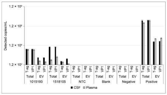 Negative controls of plasma, serum, and CSF were purchased as a pooled healthy donor sample from Innovative Research. Positive controls were generated for each biofluid by spiking 250 µL of healthy donor fluid with 5 μL of infectious EV and either used for total sample analysis or processed for EV. Infectious EV used for spike-in controls were concentrated 7 days post infection from SVGA tissue cultures as previously described [32]. A 250-µL sample of each biofluid was also processed without the addition of infectious EV as the negative control and either used for total sample analysis or processed for EV. Additional controls included a no-template control (NTC) and an extraction blank; sterile PBS was run through the isolation protocol identically to the patient samples to ensure the integrity of the extraction kit. To verify the accuracy of the probes, a standard curve was generated using serial dilutions of digested Mad1-pBR322 DNA.
