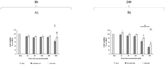 After 8 h, oleate did not induce any changes in cell viability, whereas the highest dose of palmitate elicited a significant cytotoxic effect by reducing cell viability to a value of 63% vs. bovine serum albumin (BSA) control cells (100%) (Figure 1A). Therefore, 500 µM oleate-treated cells showed a significantly high viability (+33%) compared to palmitate-treated cells. The palmitate cytotoxic effect was even more marked after 24 h, where cell viability was reduced to the value of 63% and 34% vs. BSA control cells (100%) with the doses of 250 and 500 μM, respectively (Figure 1B). Oleate-treated cells also showed dose-dependent decreases in cell viability after 24 h, reaching a value of 81% and 52% vs. BSA cells with the doses of 250 and 500 μM, respectively (Figure 1B). It should be noted that 250 and 500 μM oleate-treated cells showed a significantly higher cell viability (+28% and +53%, respectively) compared to 250 and 500 μM palmitate-treated cells (Figure 1B).