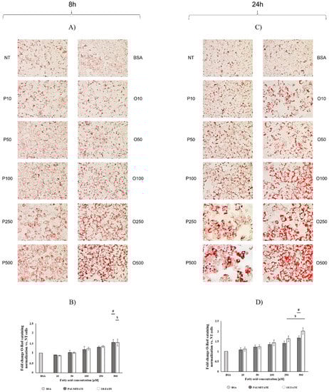 After 8 h of exposure, oleate induced a dose-dependent increase in lipid accumulation, reaching a significant 50% increase in 500 μM treated cells vs. BSA (Figure 2B). A similar trend was observed in palmitate-treated cells. After 24 h, a further dose-dependent increase in lipid accumulation was detected (Figure 2D). Oleate induced significant increases (+66% and +100%) in cellular lipid deposits in 250 μM and 500 μM treated vs. BSA cells, respectively, whereas palmitate induced a significant increase (+66%) in 500 μM treated vs. BSA cells.