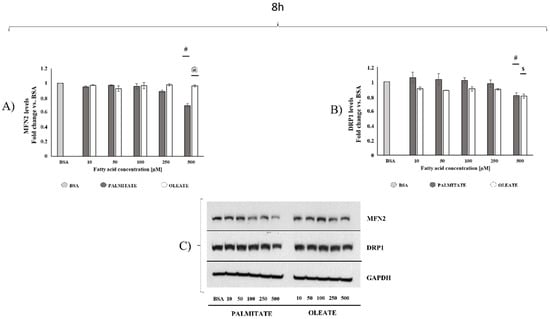 Mitochondrial dynamics markers after 8 h of exposure. Cells were treated with different doses of oleate or palmitate (0 μM, 10 μM, 50 μM, 100 μM, 250 μM and 500 μM) for 8 h. All data are presented as mean ± SEM for 4 biological replicates for mitofusin (MFN2) (A) and 3 biological replicates for dynamin-related protein 1 (DRP1) (B). (A) For MFN2, two-way ANOVA analysis showed extremely significant concentrations effect (p < 0.0001), fatty acids effect (p = 0.0001), and interaction (p < 0.0001). # p < 0.05 palmitate vs. BSA and vs. lower palmitate concentrations, @ p < 0.05 oleate vs. palmitate according to a Tukey post hoc multiple comparison test. One-way ANOVA analyses confirmed a dose-dependent effect only for palmitate. (B) As for DRP1, two-way ANOVA analysis showed an extremely significant concentration effect (p < 0.0001) and fatty acids effect (p = 0.0006), with no significant interaction. # p < 0.05 palmitate vs. BSA and vs. lower palmitate concentrations, $ p < 0.05 oleate vs. BSA according to a Tukey post hoc multiple comparison test. One-way ANOVA analyses confirmed dose-dependent effects for both oleate and palmitate. (C) Representative images of MFN2, DRP1 and loading control for protein normalization glyceraldehyde 3-phosphate dehydrogenase (GAPDH) were reported.
