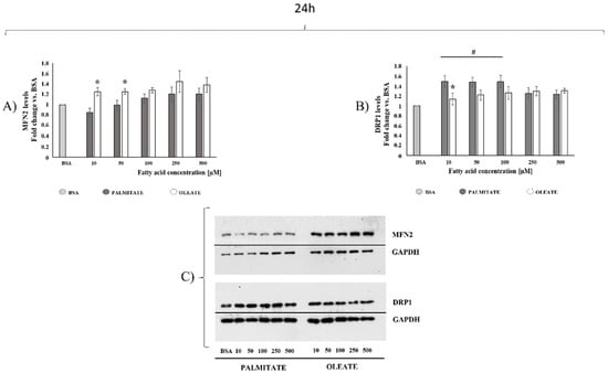 Mitochondrial dynamics markers after 24 h of exposure. Cells were treated with different doses of oleate or palmitate (0 μM, 10 μM, 50 μM, 100 μM, 250 μM and 500 μM) for 24 h. All data are presented as mean ± SEM for 5 biological replicates for MFN2 (A) and 6 biological replicates for DRP1 (B). (A) Regarding MFN2 content, two-way ANOVA analysis showed significant (p = 0.0139) concentrations effect, very significant (p = 0.0013) fatty acids effect, and no significant interaction. Student’s t-test: * p < 0.05 oleate vs. palmitate. (B) As for DRP1, two-way ANOVA analysis showed significant concentrations effect (p = 0.0041) and fatty acids effect (p = 0.0339), with no significant interaction. #p < 0.05 palmitate-treated cells vs. control cells according to a Tukey post hoc multiple comparison test. One-way ANOVA analysis confirmed a significant dose-dependent effect only for palmitate. Student’s t-test: * p < 0.05 oleate vs. palmitate. (C) Representative images of MFN2, DRP1 and loading control for protein normalization GAPDH were shown.