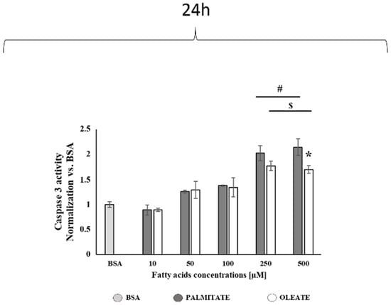 Dose-dependent effect of oleate or palmitate on caspase 3 activity after 24 h. Cells were treated with different doses of oleate or palmitate (0 μM, 10 μM, 50 μM, 100 μM, 250 μM and 500 μM) for 24 h. All data are presented as mean ± SEM for 3 or 4 biological replicates. Two-way ANOVA analysis showed that concentrations effect was extremely significant (p < 0.0001), fatty acids effect and interaction were not significant. # p < 0.05 palmitate vs. BSA and lower palmitate concentrations, $ p < 0.05 oleate vs. BSA and lower oleate concentrations according to a Tukey post hoc multiple comparison test. One-way ANOVA analysis confirmed the dose-dependent effect on caspase 3 activity for both palmitate and oleate with significant increases with the high doses. Student’s t-test: * p < 0.05 oleate vs. palmitate.