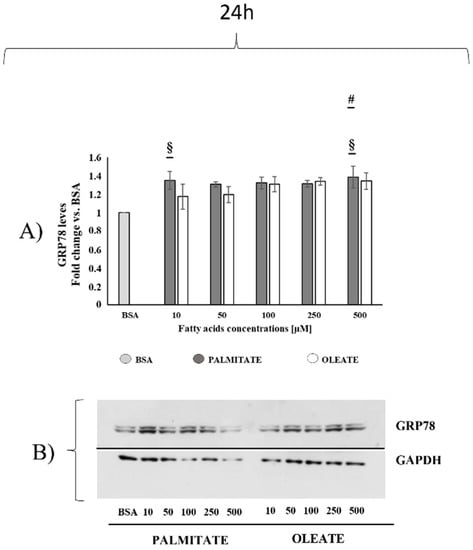 Dose-dependent effect of oleate or palmitate on glucose regulatory protein 78 (GRP78) content after 24 h. Cells were treated with different doses of oleate or palmitate (0 μM, 10 μM, 50 μM, 100 μM, 250 μM and 500 μM) for 24 h. (A) All data are presented as mean ± SEM for 4 biological replicates. Differences were evaluated for statistical significance by two-way ANOVA: concentration effect p = 0.0005 (extremely significant), fatty acids effect and interaction ns. # p < 0.05 palmitate vs. BSA according to a Tukey post hoc multiple comparison test. One-way ANOVA analysis showed that palmitate but not oleate induced significant dose-dependent changes in GRP78 content (§ p < 0.05 vs. BSA). (B) Representative images of GRP78 and loading control for protein normalization GAPDH.