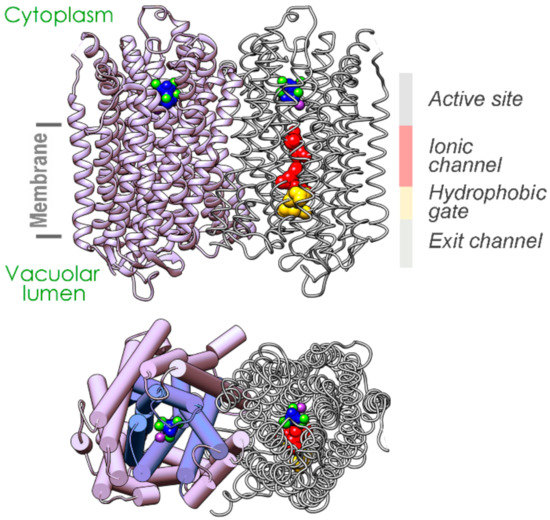Figure 1. The crystal structure of the Vigna radiata membrane pyrophosphatase (mPPase) dimer [17]. The upper panel shows a view along the membrane, whose boundaries are indicated by bars. The substrate analog (imidodiphosphate, IDP), five Mg2+ ions, and K+ ion bound in the active site are depicted in a space-filling mode (blue, green, and violet, respectively). The residues forming the ionic channel and hydrophobic gate are shown in one subunit in a space-filling node and colored red and yellow. The lower panel shows a view perpendicular to the membrane from the cytoplasmic side. The two concentric rings of the helices are shown as cylinders in one subunit.