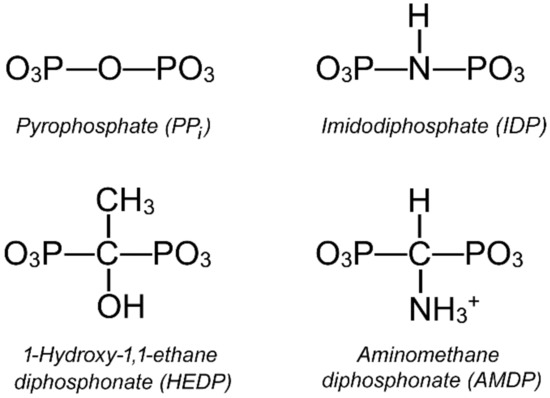 30. Gordon-Weeks, R.; Parmar, S.; Davies, T.G.E.; Leigh, R.A. Structural aspects of the effectiveness of bisphosphonates as competitive inhibitors of the plant vacuolar proton-pumping pyrophosphatase. Biochem. J. 1999, 337, 373–377. [Google Scholar] [CrossRef] [PubMed]