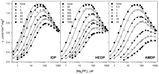 Figure 3. Steady-state kinetics of Dh-mPPase inhibition by substrate analogs. All data were collected with 5 mM Mg2+ and 50 mM K+ as the alkali metal cofactor. The abscissa shows substrate (Mg2PPi) concentration and is scaled logarithmically. The total concentrations of substrate analog (in µM) corresponding to different symbols are defined on each panel. Its solubility limited the range of its concentrations used. The lines were calculated using Equation (2) with the parameter values found in Table 1.