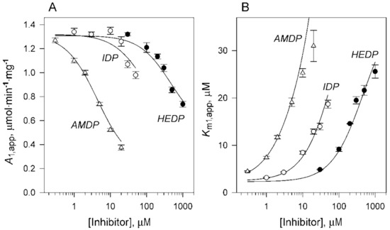 Therefore, the data were further analyzed using Scheme 2, in which the simple competition of substrate and inhibitor is supplemented with the formation of a catalytically active mixed enzyme–substrate–inhibitor complex (IES). The global fitting of Equation (2) to the rate data indicated that, despite many parameters, there is only one stable set of parameters for each inhibitor (Table 1). Ki2 for IDP and HEDP was the only exception, because it could be set to any value above the indicated limits without an effect on fit quality, as characterized by the root-mean-square deviation (RMSD) of the rate data. This finding indicates that the second molecule of these inhibitors binds very weakly. In contrast, setting Ki2 for AMDP to infinity made the fit significantly worse (Table S1), indicating the formation of the IEI complex. This deduction explains the marked effect of AMDP, but not of the other inhibitors, at the highest substrate concentrations in Figure 3. A similar pattern of AMDP inhibition was observed with Leptospira biflexa K+-dependent H+-PPase (Artukka, E., Malinen, A.M., Baykov, A.A., unpublished).