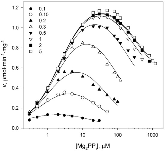 Here we confirmed the substrate inhibition of Dh-mPPase (Figure 3) by using a refined assay protocol. Specifically, we considered the PPi interference with Pi assay (Figure S1) and avoided the use of tetramethylammonium hydroxide in the buffer preparation after noting that some batches of this alkali supplied in glass containers have an adverse effect on PPase activity [28]. It was also confirmed that the substrate, Mg2PPi, retains solubility up to 1.2 mM during the activity assay at 25 °C [28].