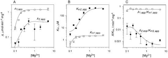 Figure 6. Secondary dependence of the kinetic parameters in Scheme 1 (A), maximal activities; (B), Km values; (C), their ratios) on free Mg2+ concentration, as calculated from the data in Figure 5. All axes are scaled logarithmically. The lines were calculated using Equations (1) and (3a–d) with the parameter values found in Table 2.