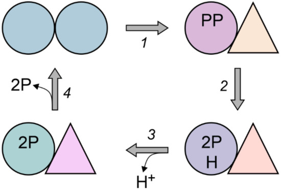 To sum up, the new data support and further develop the notion that the two active sites cooperate in mPPase catalysis. The results of our investigation show that substrate or substrate analog binding to subunit A distorts the structure of the subunit B active site, impeding its substrate binding and conversion ability. We speculate that the binding energy is thus stored as a conformational strain. We hypothesize that the stored energy is back-used to remove products from subunit A and return its active site into the resting state. According to Shah et al. [44], substrate-binding affects active site closure via the loop connecting α-helices 5 and 6 in mPPase. After substrate hydrolysis and ion transport, the active site should be unclosed for the next catalytic cycle. The complete sequence of events in H+ transport could be as follows: (a) substrate binds to active site A, resulting in a conformational change (site closure) that is propagated to active site B in the other subunit; (b) the substrate is attacked by the activated water molecule located at the entrance to the ion-conducting channel. This reaction yields two phosphate molecules that remain bound in the active site and a proton, which creates high local acidity; (c) the proton moves via a water wire to the other side of the membrane down the locally favorable proton potential gradient; (d) the loop lid opens because its weaker interactions with the two phosphates cannot offset the conformational strain, and the phosphates leave the active site. This sequence of events is shown schematically in Figure 7, where different shapes correspond to different subunit structures and energy states. The scheme assumes that the binding energy is accumulated in the right subunit in step 1 and released in step 4. Alternatively, the stored energy may drive H+ transport in the left subunit (step 3).