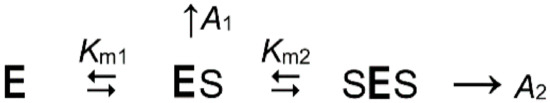 Equation (1) gives the rate equation for Scheme 1, where [S] is substrate concentration. When fitting Equation (1) to the bell-shaped dependencies of v on [S], the maximum rate, the rate at maximal [S], and [S] values corresponding to half-effects on the ascending and descending parts were used as initial estimates of the parameters A1, A2, Km1, and Km2, respectively.