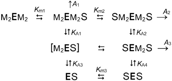 v = {A1 + A2[S]/Km2 + A3KA2[S]/(Km2[M]2)}/{1 + Km1/[S] + KA1KA3/[M]4 + [S](1 + KA2/[M]2 + KA2KA4/[M]4)/Km2}