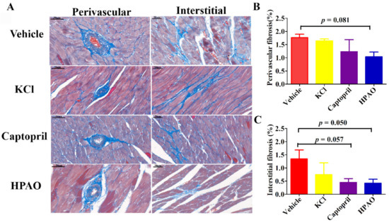 Perivascular and interstitial cardiac fibrosis were observed in SHR after six weeks (Figure 2). The perivascular volume fraction decreased from 1.76 ± 0.13% in the Vehicle-treated group to 1.04 ± 0.17% in the HPAO group (p = 0.081). The interstitial volume fraction also decreased in SHR from the values of 1.34 ± 0.34% in the Vehicle-treated group to 0.42 ± 0.15% in the HPAO group (p = 0.050). Again, Captopril (0.45 ± 0.14%, p = 0.057) attenuated the perivascular and interstitial volume fraction but could not be significantly compared to the Vehicle-treated group (Figure 2B,C). These data indicated that the 6-week administration of HPAO could attenuate interstitial cardiac fibrosis, which could be an important therapeutic target for HF [28].