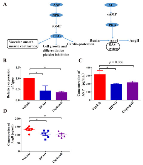 The Nppa gene participated in ten pathways. Five out of the 10 signaling pathways were up-regulated by Captopril, such as aldosterone synthesis and secretion and the cAMP, thermogenesis, and oxytocin signaling pathways (Figure S2). The oxytocin signaling pathway was also up-regulated in the HPAO group (FDR q-value = 0.78). To understand which pathway was specifically affected by the Nppa gene, known regulators of associated pathways are summarized (Figure 4A). To verify the hub of the Nppa gene expression, the mRNA expression level of Nppa (Figure 4B) and the ANP protein level (Figure 4C) were analyzed. To verify which of the downstream regulators in these pathways change, the plasma level of AngII was examined (Figure 4D). These data suggested that HPAO could down-regulate the mRNA level of Nppa and reduce the synthesis of ANP and AngII at the protein levels in the plasma, as these levels differed significantly (Figure 4C,D, p < 0.05) between the HPAO and Vehicle-treated groups.