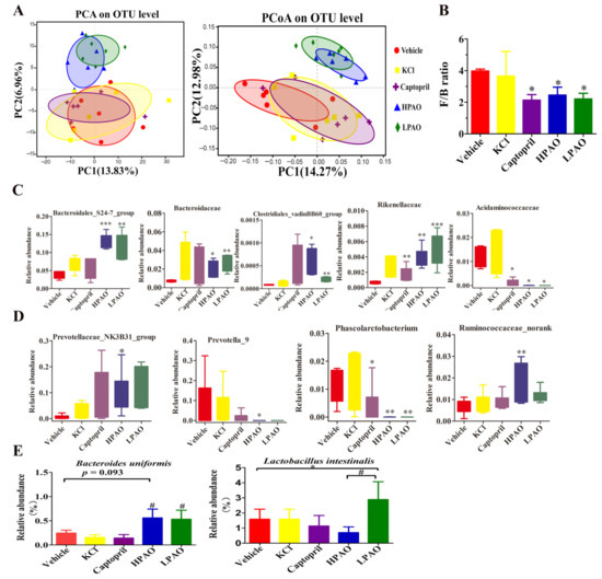The effect of Vehicle, KCl, Captopril, HPAO, and LPAO supplementation in GM. (A) HPAO and LPAO alter the composition of GM significantly compared to the KCl, Captopril, and vehicle groups; the data indicate unweighted UniFrac PCA and unweighted UniFrac PCoA. (B) The Firmicutes to Bacteroidetes ratio, as a marker of gut dysbiosis, is significantly lower in HPAO, LPAO, and Captopril (p < 0.05). One-way ANOVA with Tukey’s adjustments for multiple comparison was used. (C) The relative abundance of significant families in the top 24 entries between the Vehicle, KCl, Captopril, HPAO, and LPAO groups. Statistical analysis was performed using t-test. (D) Relative abundance of significant genera in top 40 between the Vehicle, KCl, Captopril, HPAO, and LPAO groups. One-way ANOVA with LSD adjustments for multiple comparison was used. (E) PAO had higher levels of bacteria from the Bacteroides uniformis and Lactobacillus intestinalis species than the Vehicle group (p = 0.093). Data were mean ± SEM * p < 0.05, ** p < 0.01, *** p < 0.001 vs. Vehicle, # p < 0.05 vs. KCl and Captopril groups, respectively. One-way ANOVA with LSD adjustments for multiple comparison was used.