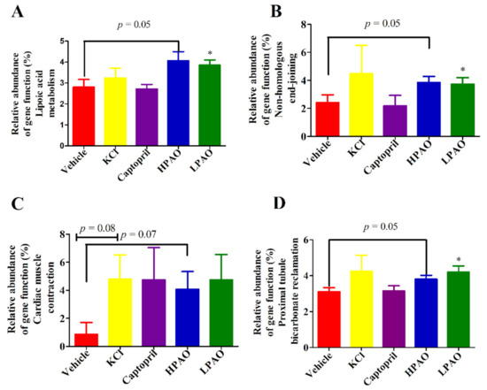 Selected biological pathways and functional categories of GM displaying differences in the relative abundance in GM. Relative abundance of the gene function (%). (A) Lipoic acid metabolism, (B) Non-homologous end-joining, (C) Cardiac muscle contraction, and (D) Proximal tubule bicarbonate reclamation. Data were mean ± SEM. Statistical analysis was performed using t-test * p < 0.05 vs. Vehicle.