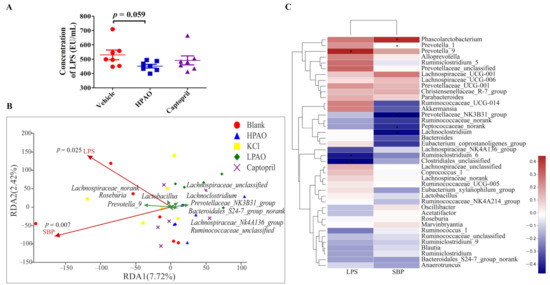 Correlation analysis between changes of plasma LPS level, intestinal bacteria, and SBP. (A) The concentration of LPS in Vehicle, HPAO, and Captopril. Data were mean ± SEM (t-test, n = 7). (B) The redundancy analysis between LPS, SBP, and ten taxa. (C) The correlation analysis between LPS, BP, and GM in the top twenty entries at the family and genera levels (* p ≤ 0.05).