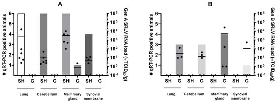 SRLV RNA detection in target organs of sheep (SH) and goats (G) at 9 months after homologous and heterologous genotype A (panel A) and B (panel B) strain infection. Bars indicate the number of qPCR positive animals. Each dot corresponds to one animal and represents the viral load. The mean viral load is indicated by the horizontal line.