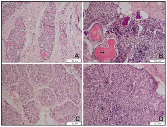 Representative histopathological lesions in the mammary gland of genotype A and B SRLV strain infected sheep and goats at 9 months p.i. (A) Section from an uninfected sheep exhibiting structured acini and no lymphocyte infiltration. (B) Section from a sheep infected with a genotype A strain exhibiting a massive lymphocyte infiltration (asterisks) and a destruction of the acini structure (arrow). (C) Section from an uninfected goat exhibiting tissues with normal glandular structures and no lymphocytic infiltrate. (D) Section from a goat infected with a genotype B strain exhibiting lesions with massive lymphocyte infiltrations and an atrophy of the acini. Magnification ×20.