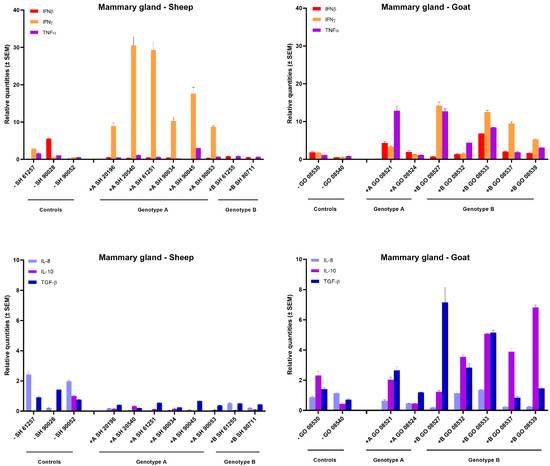 Cytokines’ mRNA expression in the mammary gland of genotype A and genotype B infected sheep and goats. mRNA expression was detected by qPCR for IFN-α, IFN-β, IFN-γ, TNF-α, IL-8, IL-10, TGF-β1 and GM-CSF.