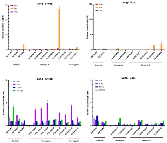 Cytokines’ mRNA expression in the lung of genotype A and genotype B infected sheep and goats. mRNA expression was detected by qPCR for IFN-α, IFN-β, IFN-γ, TNF-α, IL-8, IL-10, TGF-β1 and GM-CSF.