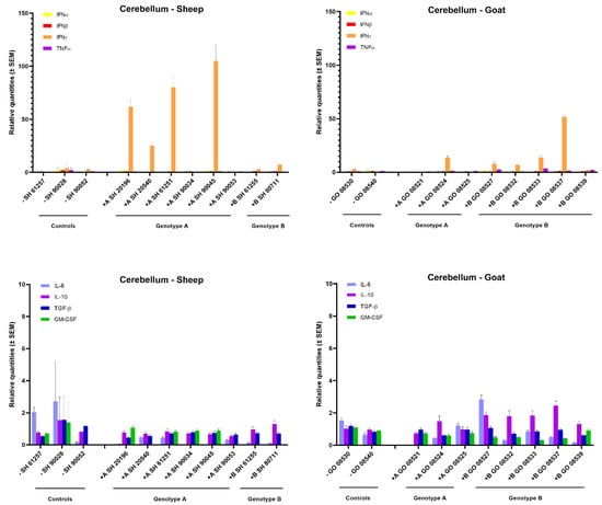 Cytokines’ mRNA expression in the cerebellum of genotype A and genotype B infected sheep and goats. mRNA expression was detected by qPCR for IFN-α, IFN-β, IFN-γ, TNF-α, IL-8, IL-10, TGF-β1 and GM-CSF.