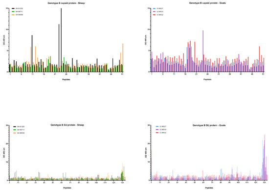 Pepscan analysis of sera from genotype B infected sheep and goats against linear peptides of the capsid and surface proteins of the genotype B strain used as inoculum. Sera were tested at a dilution of 1/100, and each bar represents the reactivity of one serum against one single peptide.
