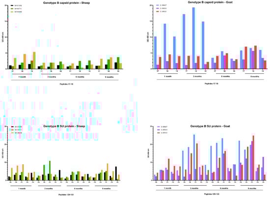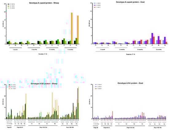 A pepscan analysis was performed to study the development of the antibody response against epitopes of the CA and SU proteins of genotype A and B strains. A set of overlapping peptides (15 aa) with an offset of 4 aa and an overlap of 11 aa were synthetized and purified based on the complete sequence of the CA and the SU proteins of the genotype A and B strains used to inoculate the animals. For the genotype A strain, the analysis consisted of 50 peptides for the CA and 180 peptides for the SU, while for the genotype B strain, a total of 51 peptides for the CA and 134 peptides for the SU proteins were included in the pepscan testing. The peptide synthesis was performed by JPT Peptide Technologies using the SPOT-synthesis technology (JPT Peptide Technologies GmbH, Berlin, Germany), and each peptide was biotinylated (Biotides) at the N-terminus to allow their selective immobilization in 96-well streptavidin-coated plates (Thermo Fisher Scientific, Waltham, MA, USA). Wells were coated with 0.2 nM of Biotides resuspended in PBS with 0.05% Tween 20 and 40% of DMSO, then washed and blocked for 30 min at room temperature with a solution of PBS, 400 µM of Biotin (Sigma-Aldrich, St. Louis, MO, USA) and 20% of sucrose (Sigma-Aldrich, St. Louis, MO, USA). Newly coated plates were sealed and stored overnight at 4 °C until use. Sera from (i) a negative control sheep and goat, (ii) 3 sheep and 3 goats inoculated with the genotype A strain and (iii) 3 sheep and 3 goats inoculated with the genotype B strain collected at 1, 3, 6 and 9 months p.i. were tested in the pepscan. Sera were diluted 1/100 in a blocking buffer and incubated for 1 h at room temperature on a shaking incubator at 300 rpm. After incubation of the coated peptides with the serum samples, wells were washed 4 times using a washing solution composed of PBS with 0.05% Tween. Afterwards, wells were incubated with a solution of anti-ruminant IgG-HRP conjugate antibodies (IDvet, Grabels, France) for 30 min at room temperature on a shaking incubator at 300 rpm. After the second washing step, plates were revealed with a substrate solution (TMB) for 15 min and stopped with a stop solution (IDvet, Grabels, France). The optical density was subsequently read at 450 nm (OD450) with an ELISA reader.