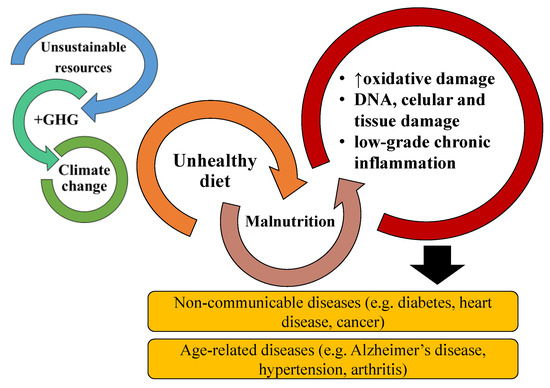 The relationship and risk of noncommunicable diseases and age-associated diseases are increased by malnutrition originating from poor and unhealthy diets. Malnutrition promotes increased oxidative stress, DNA, cellular and tissue damage, and chronic inflammation. Chronic inflammation is associated with most NCDs and AADs. Bad diets are also associated with the unsustainable exploitation of resources, greenhouse gases (GHG) emissions, and impacts on climate change.