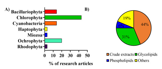 The included works were analyzed and were categorized by considering the microalga phylum (Figure 2A) and the type of lipid extracts or fractions that were used (Figure 2B). Microalgae from the phylum Chlorophyta were the most studied regarding anti-inflammatory activity. Most of the studies used crude lipid extracts in the anti-inflammatory activity assays [18,19,20]. In contrast, others used lipid fractions in specific classes of lipids, such as glycolipids, phospholipids, or others (Figure 2B) [21,22]. Among these, the ones that used glycolipids from microalgae enriched fractions were the most studied [23,24,25].