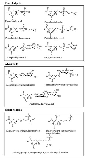 The microalgae lipidome includes two main groups of lipids: neutral lipids (fatty acids, TAG, and sterols) and polar lipids (sphingolipids, phospholipids (PL), glycolipids (GL), and betaine lipids (BL)). Polar lipids can develop several biological functions, acting as the structural components of cell membranes, which constitute lipoproteins, energy reserves, and signaling molecules [26].