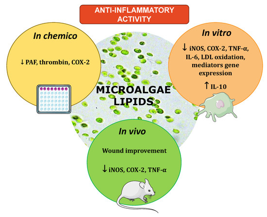 Schematic representation of the anti-inflammatory potential of microalgae lipids. The scheme was based on the data collected and overviewed in Section 3. Microalgae crude lipid extracts, glycolipids, phospholipids, and other isolated lipids (e.g., oxylipins) displayed in vivo and in vitro anti-inflammatory activity with down-regulation of the pro-inflammatory mediators COX-2, iNOS, TNF-α, IL-6, and PAF.
