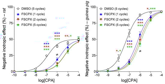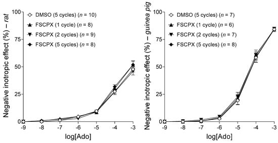 2.4. The Influence of Different Administration Regimens on the Effect of FSCPX in Rat and Guinea Pig Left Atria