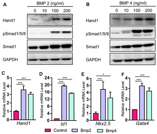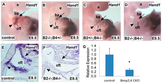 2.1. Hand1 Expression Decreases in a Dose-Sensitive Manner in Response to Bmp2 and Bmp4 Deficiency during Heart Development
