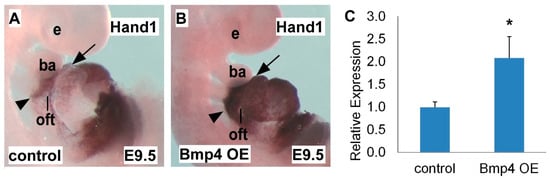 2.2. Hand1 is Upregulated in Bmp4 OE Embryos