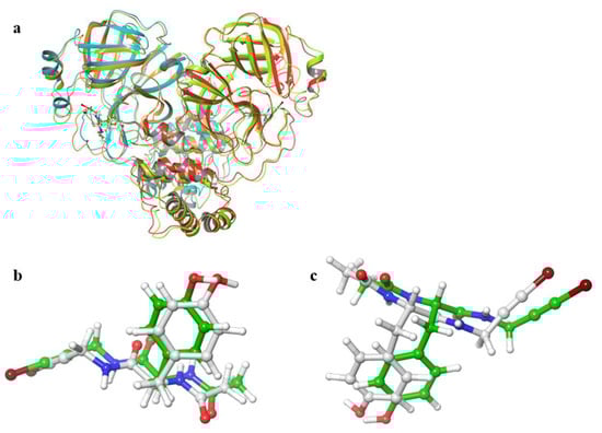 3D structures of SARS-CoV-2 Mpro before and after MD simulations. (a) Protein-ligand complex. Red and orange ribbons indicate chains A and B before MD simulations (0 ns), and light green and light blue indicate chains A and B after MD simulations (1000 ns). (b) Ligand in chain A. (c) Ligand in chain B. White and green ligands are the structures before and after MD simulation, respectively.