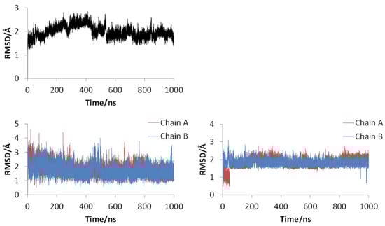 Figure 2 shows the 3D structures of wild-type SARS-CoV-2 Mpro before and after MD simulation. In addition, Figure 3 shows the main-chain RMSDs, ligand RMSDs, and catalytic dyad RMSDs throughout the wild-type MD trajectory. As shown in these figures, the conformation of the wild-type SARS-CoV-2 Mpro did not change significantly before and after the simulation, and all RMSDs converged. Throughout the simulations, not only the overall structure shown in Figure 2a but also the ligands retained similar structures as shown in Figure 2b, indicating that the 1000-ns MD simulation obtained the equilibrium structure for wild-type Mpro. In particular, the convergence of the catalytic dyad and the ligand RMSDs suggests that Mpro is responsible for the enzymatic reaction and that the experimental structure is reasonable for the pose of the inhibitor. In this study, the calculations were performed in the homodimeric state, and our results are consistent with a previous study suggesting that the catalytic dyad does not change significantly in the homodimeric state [].